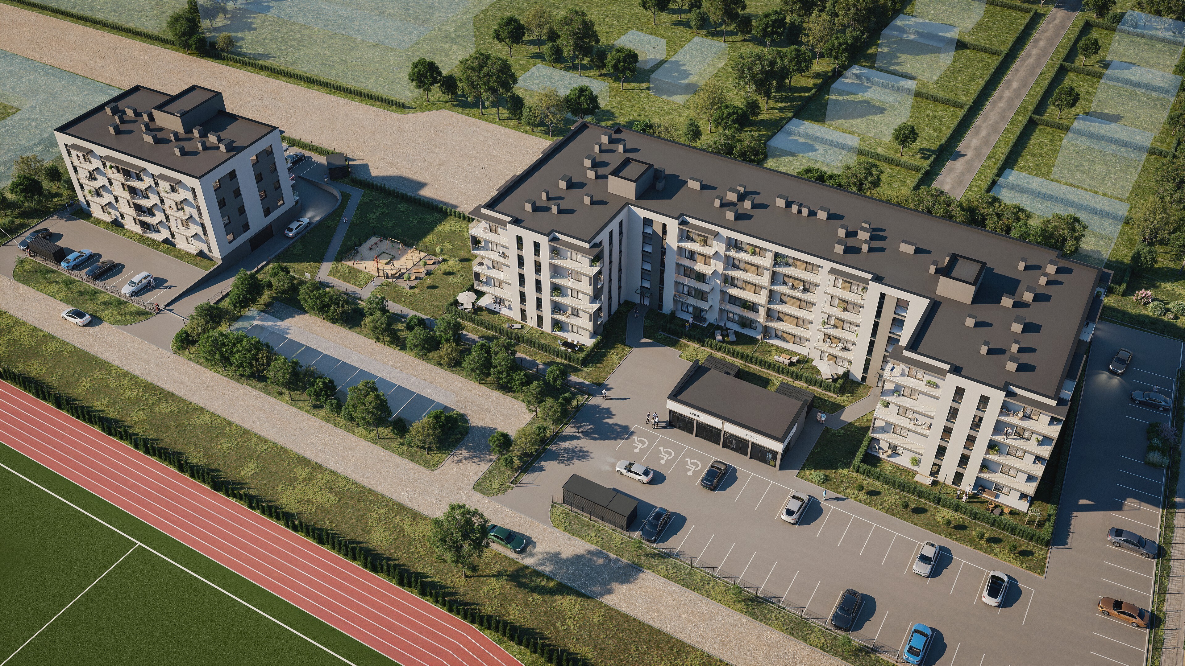 Nasza inwestycja obejmuje trzy nowoczesne budynki mieszkalne, realizowane i sprzedawane etapami, a także lokale usługowe, które zapewnią mieszkańcom wygodny dostęp do najpotrzebniejszych punktów w zasięgu kilku kroków. Projekt powstaje z myślą o osobach poszukujących spokojnej, dobrze skomunikowanej przestrzeni do życia, jak i o przedsiębiorcach chcących rozwijać swój biznes w dynamicznie rozwijającej się okolicy.